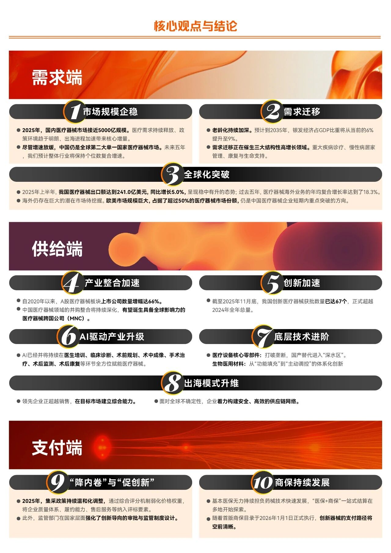 短期来看,随着首版商保目录于2026年1月1日正式执行,创新器械的支付路径将随创新药支付路径的清晰而变得清晰。长期而言,商保的壮大将直接反哺研发端,形成“支付保障-市场回报-研发投入”的飞轮效应。对于医疗器械企业而言,这意味着产品的临床价值与创新属性,将不仅仅通过集采定价体现,更能通过多元支付市场获得更合理、更可持续的价值回报,最终推动整个产业向更高价值链攀升。
