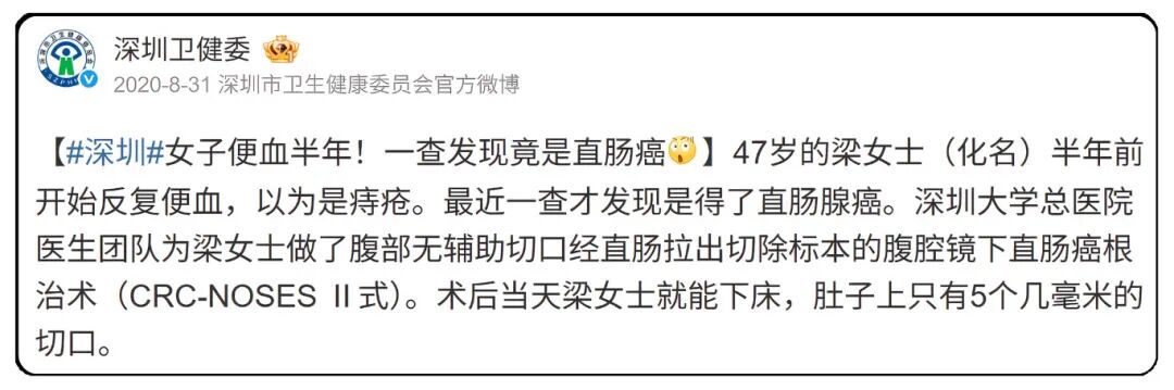 此前深圳卫健委也报导过,47岁梁女士,半年来反复便血,去医院检查才发现,竟是直肠癌!