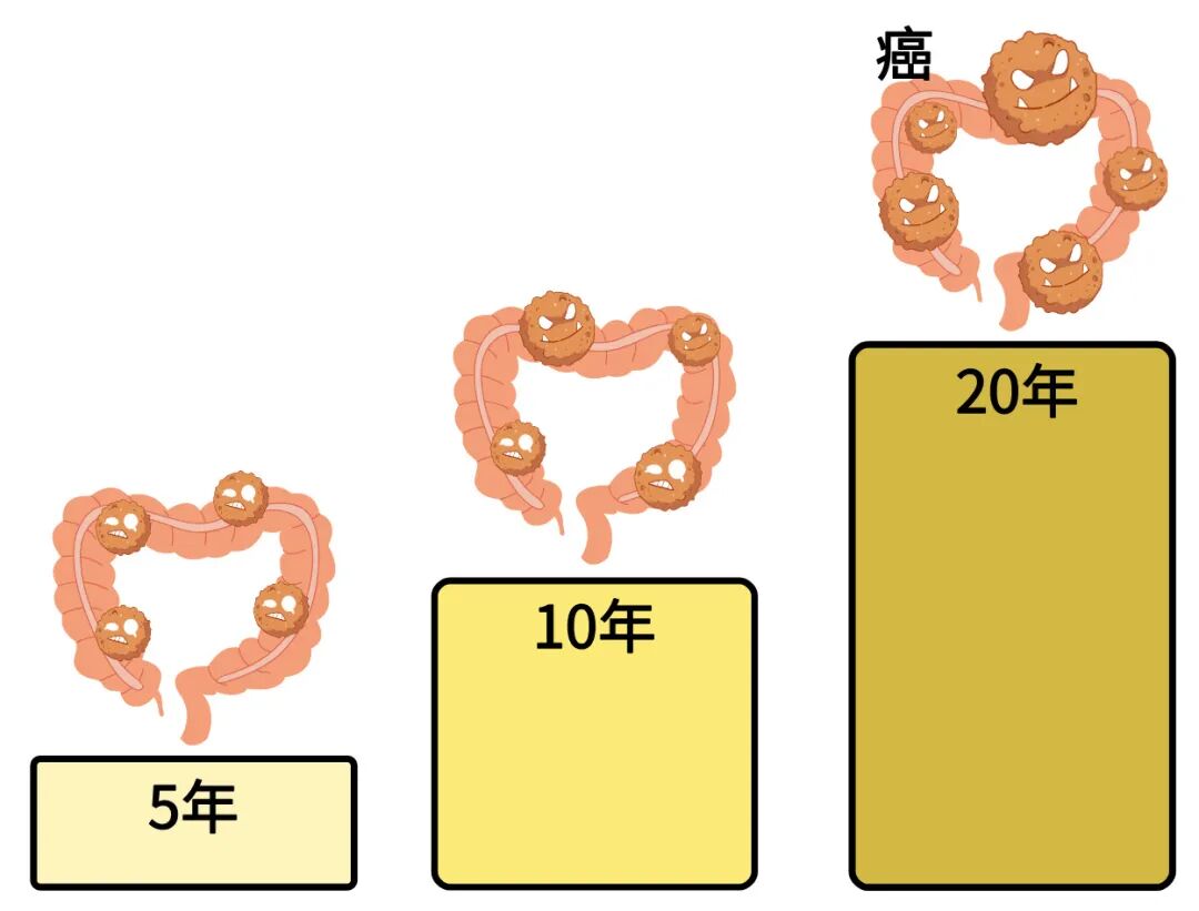 ● 病程越长,风险越高:确诊溃疡性结肠炎后,随着时间推移,发生结直肠癌的几率逐年累积。如果病程超过20年,患者患上结直肠癌的风险将比普通人高出10~15倍;