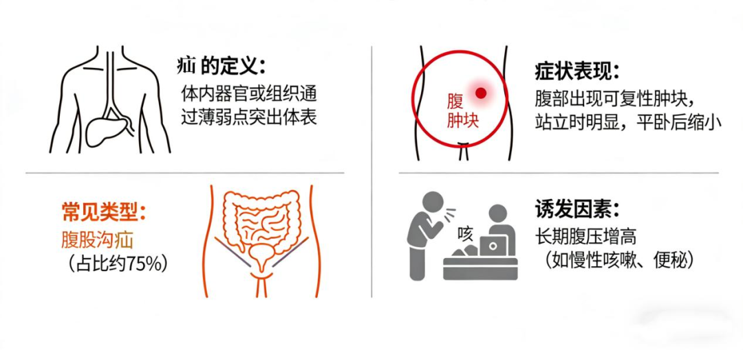 疝的类型多样,不同类型对应不同的发病原因与身体部位,其中腹股沟疝最为高发。