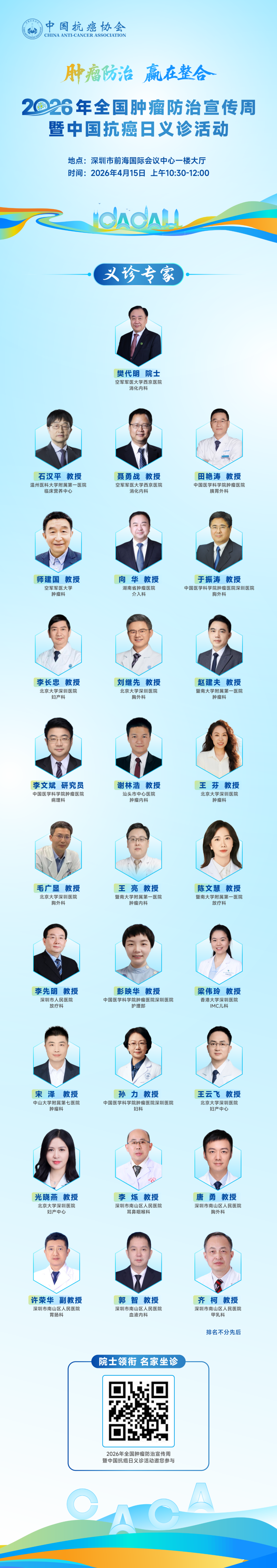 2026年全国肿瘤防治宣传周暨中国抗癌日期间,协会将于4月15日(星期三)上午10:30-12:00,在深圳市前海国际会议中心一楼大厅举办大型公益义诊活动。活动当天,中国抗癌协会理事长樊代明院士携手20余位国内肿瘤诊疗领域权威专家,为广大患者提供面对面的专业诊疗咨询与科普答疑,以仁心妙术扶生,以科学科普护航。