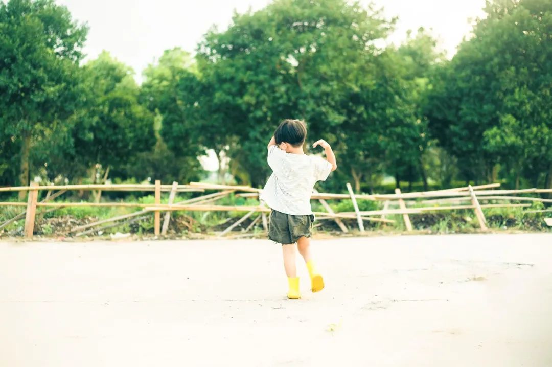 她为儿子穿好了雨鞋和雨衣,鼓励他说:“别怕,拉紧妈妈的手,你就当是在游戏中做任务,我们一起冲到终点好不好”