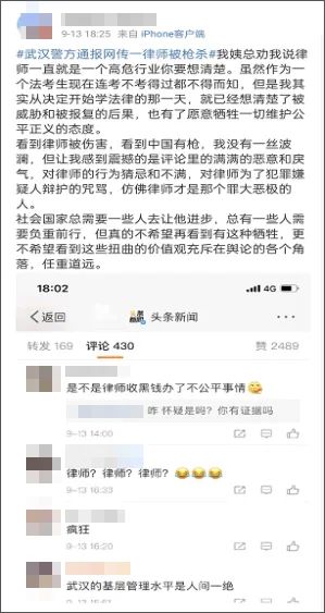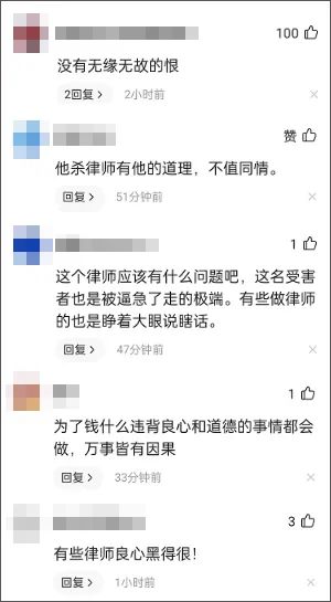 还有人说,没有无缘无故的恨,这个律师被杀,肯定是他自己不好。