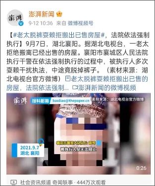 这是前几天刚刚发生的一个法拍事情,欠钱不还,房子被拍卖了,老太赖在里面不走,对着法院的人,把自己的裤子脱掉。