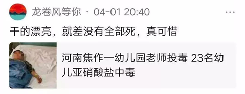 同一天,河南焦作幼儿园老师投毒至23名孩子中毒,众人痛心担忧之时,他却发文称“干得漂亮”。