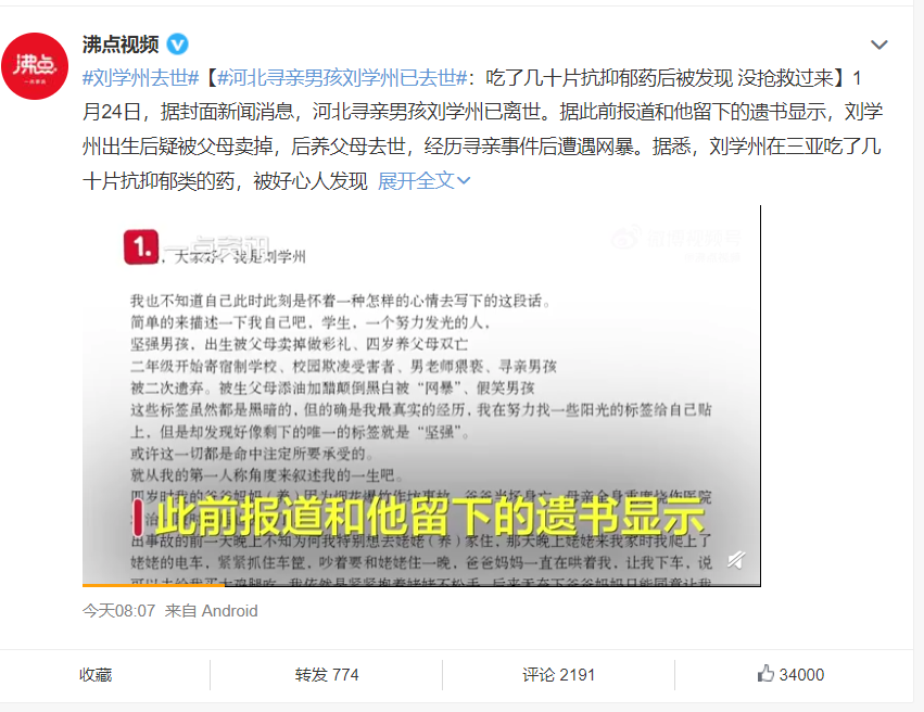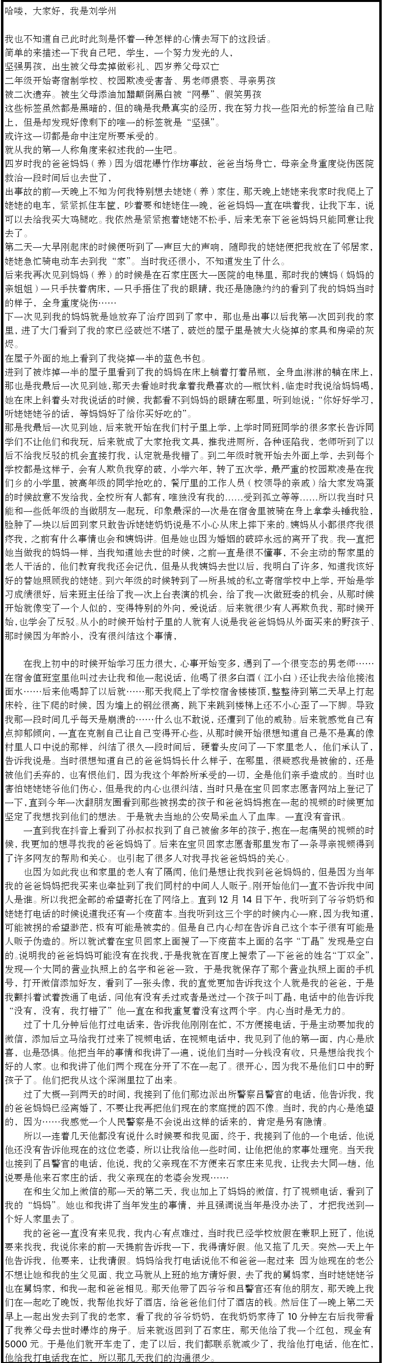 今天凌晨的时候,河北邢台寻亲男孩刘学州在微博上发了一篇很长的遗书,遗书的开头就让人痛心:
