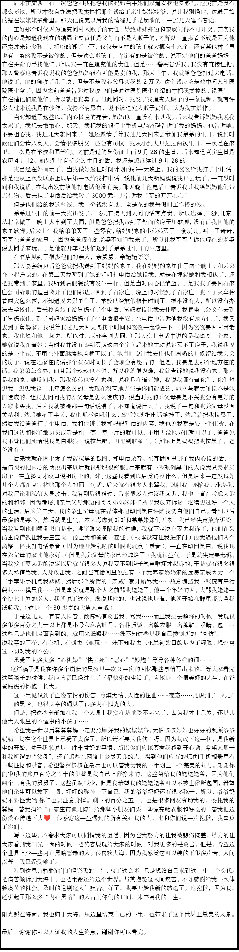 剩下的百分之五十,也是很多网友资助我的,委托我的舅妈,替我捐给“石家庄市孤儿院”给那些小朋友们买一些漂亮哒衣服和好吃的。替我把这些爱心传递下去。很感谢这一生遇到的所有关心我的人,也和你们说一声抱歉,我辜负了你们。
