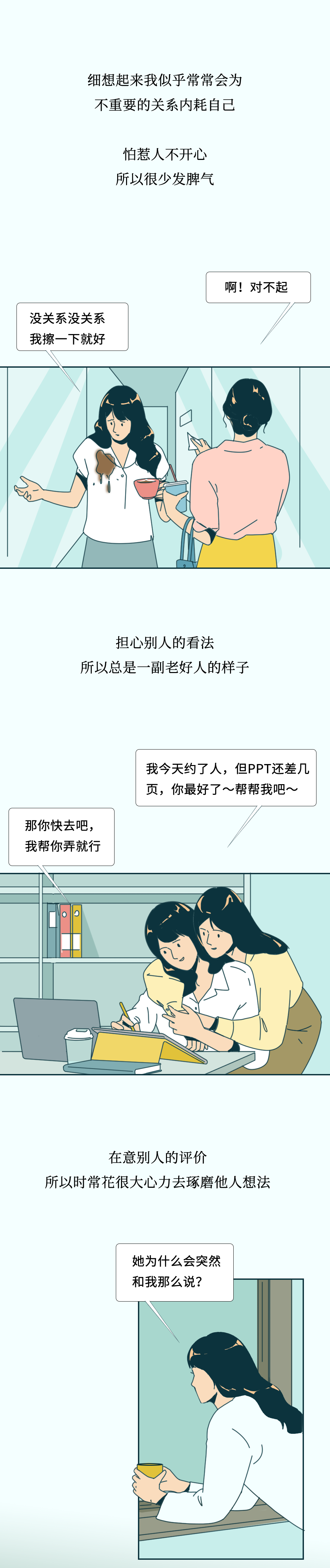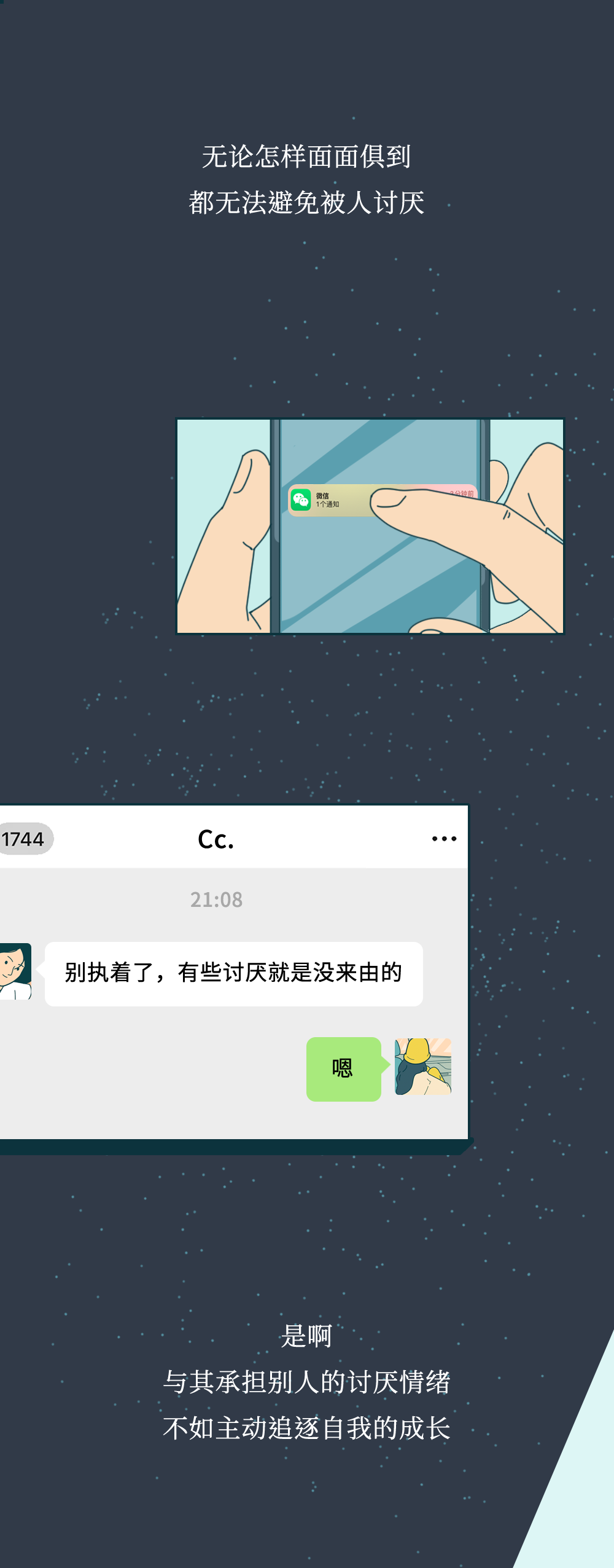 换个角度来讲,“讨厌”这种情绪本身就和自己没太大关系,是对方需要自我去消化的,就像阿德勒所说“每个人都有自己独立的课题,我怎么表达想法是我的课题,跟你没有关系;而你接不接受我的想法是你的课题,跟我没有关系。”