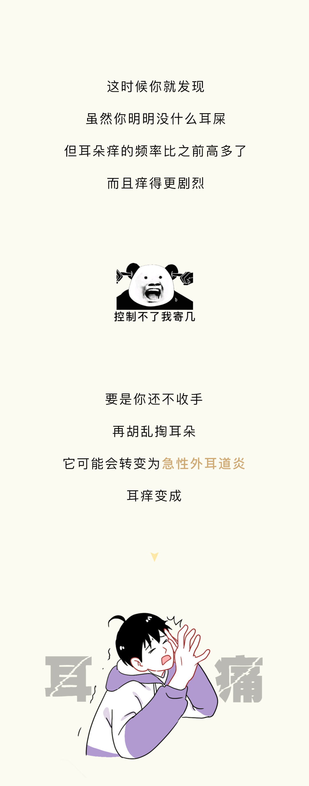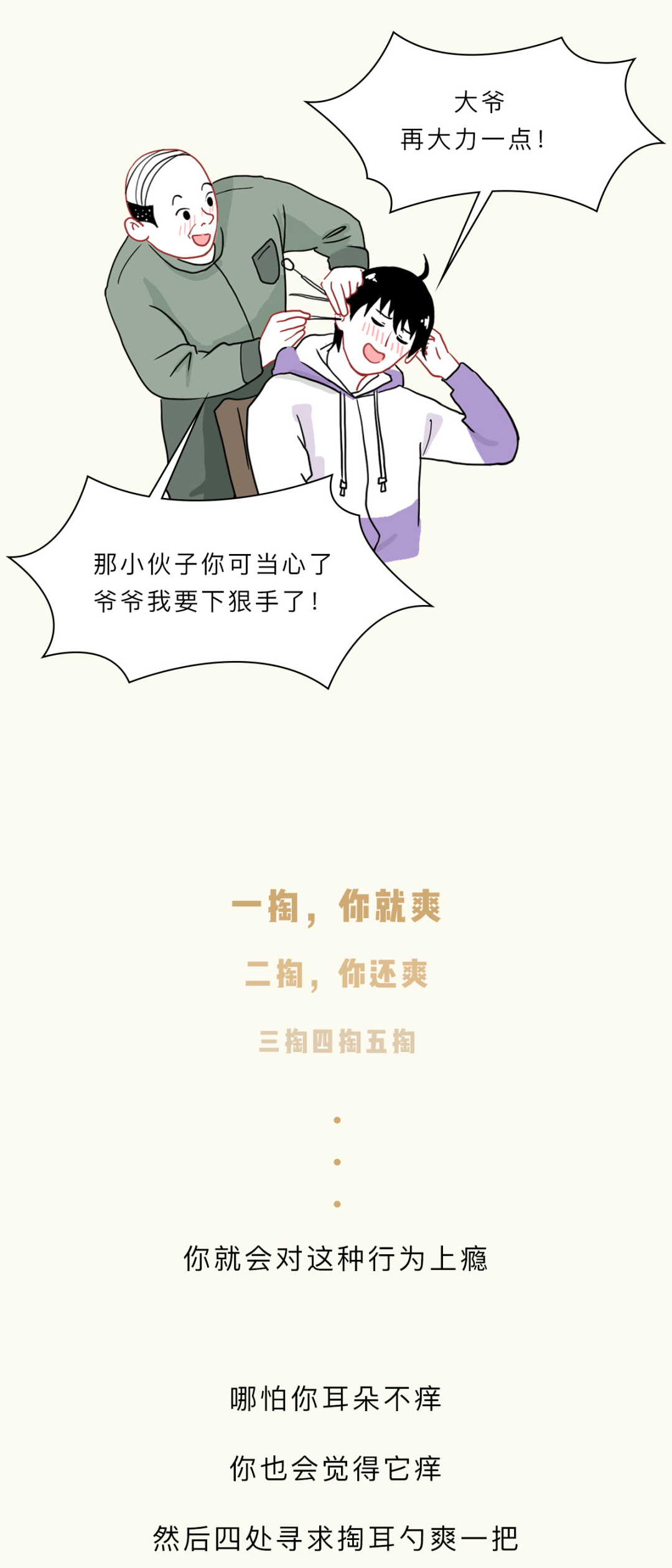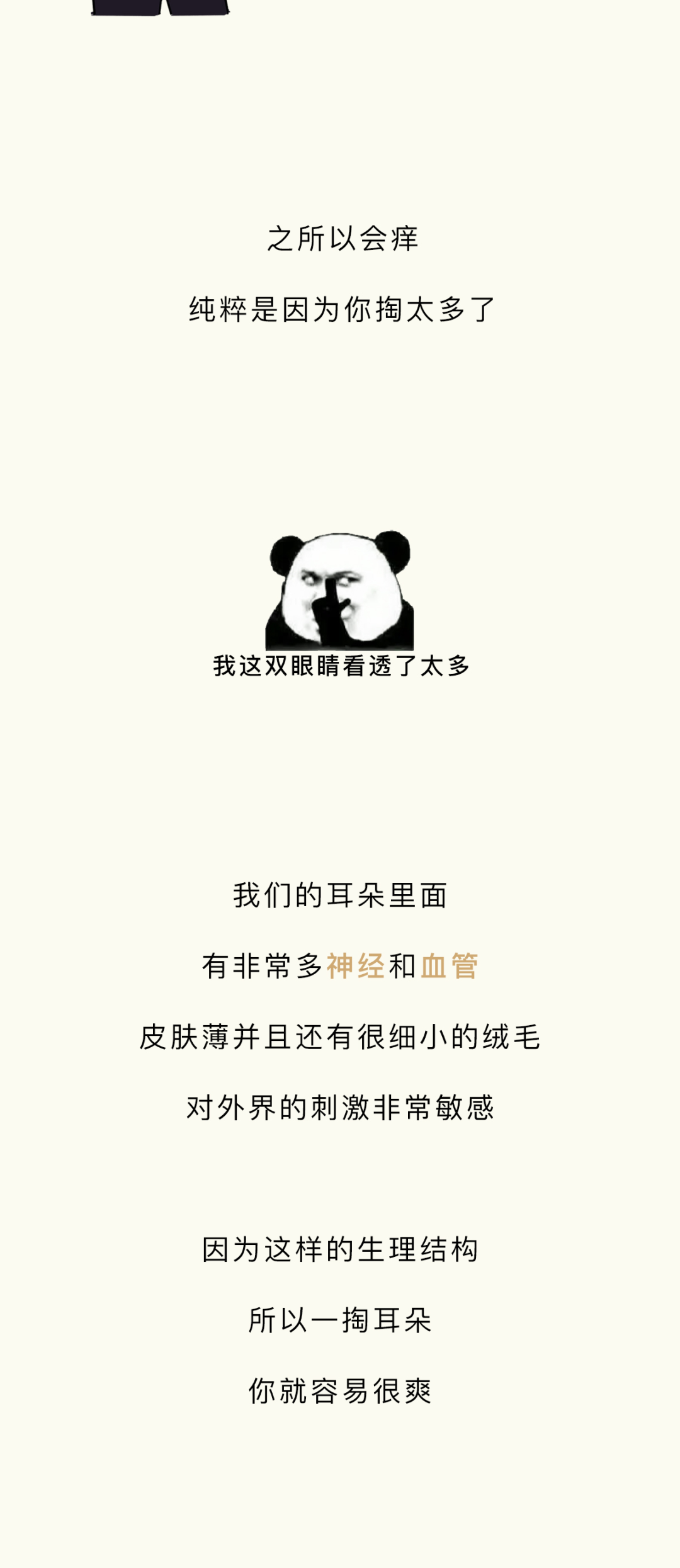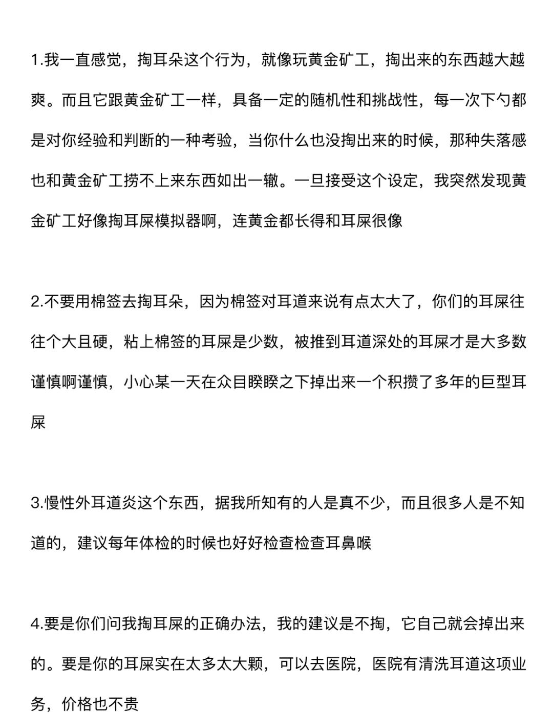 附录1.我一直感觉,掏耳朵这个行为,就像玩黄金矿工,掏出来的东西越大越爽。而且它跟黄金矿工一样,具备一定的随机性和挑战性,每一次下勺都是对你经验和判断的一种考验,当你什么也没掏出来的时候,那种失落感也和黄金矿工捞不上来东西如出一辙。一旦接受这个设定,我突然发现黄金矿工好像掏耳屎模拟器啊,连黄金都长得和耳屎很像2.不要用棉签去掏耳朵,因为棉签对耳道来说有点太大了,你们的耳屎往往个大且硬,粘上棉签的耳屎是少数,被推到耳道深处的耳屎才是大多数,谨慎啊谨慎,小心某一天在众目睽睽之下掉出来一个积攒了多年的巨型耳屎3.慢性外耳道炎这个东西,据我所知有的人是真不少,而且很多人是不知道的,建议每年体检的时候也好好看看耳鼻喉4.要是你们问我掏耳屎的正确办法,我的建议是不掏,它自己就会掉出来的。要是你的耳屎实在太多太大颗,可以去医院,医院有清洗耳道这项业务,价格也不贵参考资料[1]吴丽华,蒋刈,陈娟,黄少鹏,刘庆华,李瑞玉,叶青.真菌性外耳道炎的病原学特征及治疗效果[J].中华医院感染学杂志,2019,29(21):3288-3292.[2]李朝品.外耳道瘙痒症流行情况的调查研究[J].锦州医学院学报,1999(06):15-20.[3]周柯,孙菲,查定军,刘家云,马越云,郝晓柯,徐修礼.慢性外耳道炎患者分离溶藻弧菌的鉴定及生物学特性分析[J].中国病原生物学杂志,2020,15(02):146-151.DOI:10.13350/j.cjpb.200205.