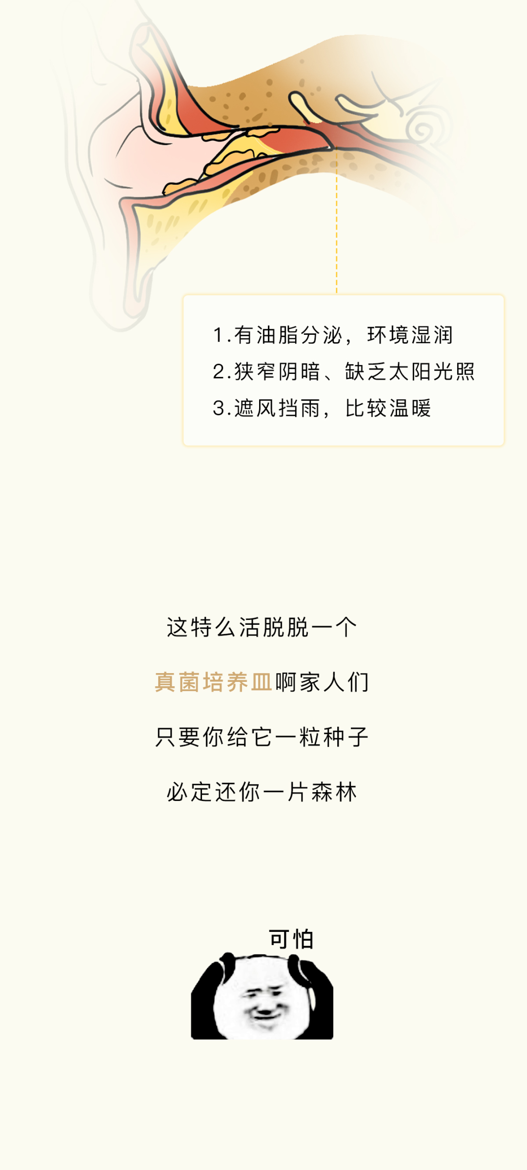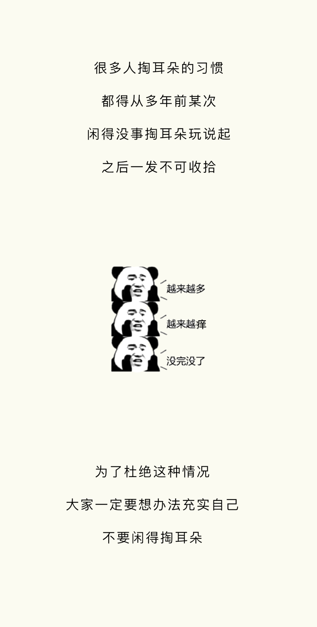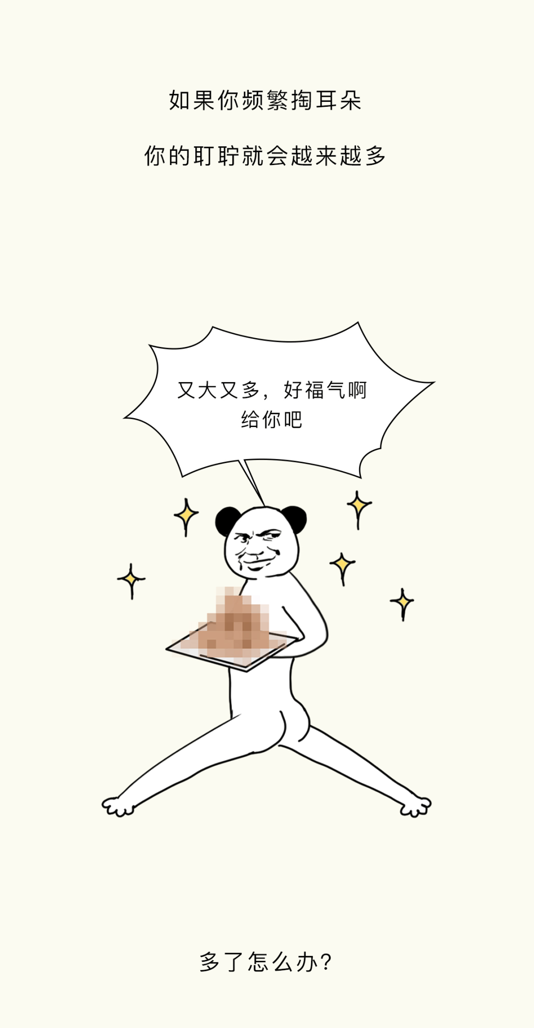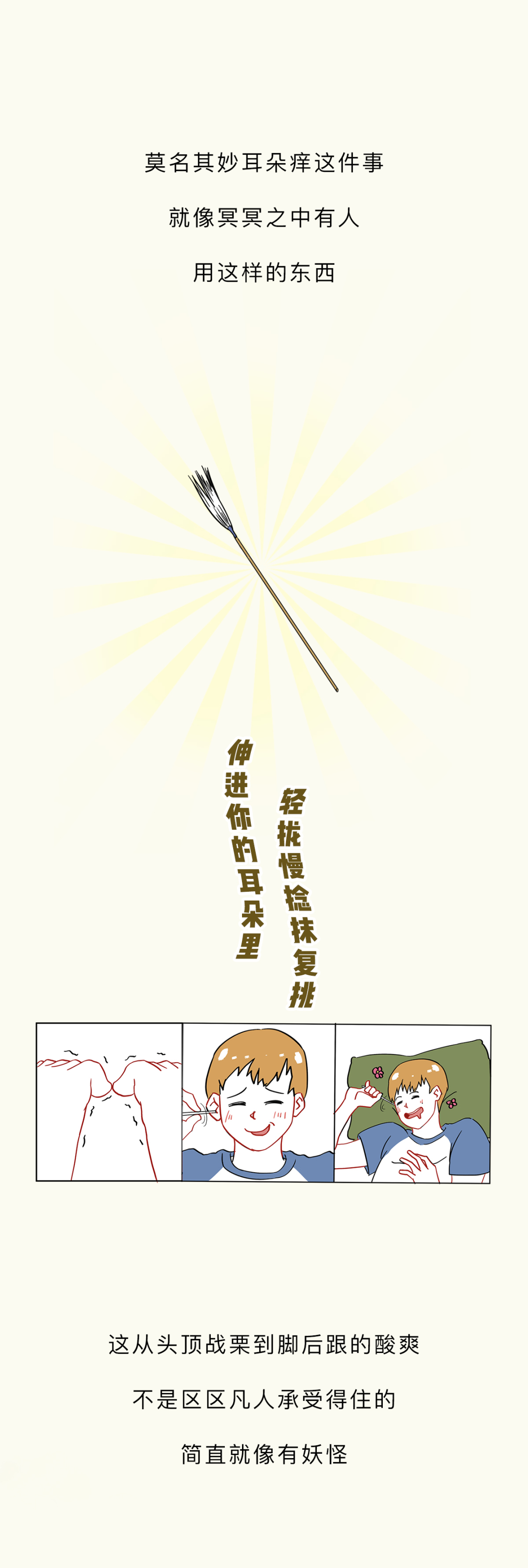 附录1.我一直感觉,掏耳朵这个行为,就像玩黄金矿工,掏出来的东西越大越爽。而且它跟黄金矿工一样,具备一定的随机性和挑战性,每一次下勺都是对你经验和判断的一种考验,当你什么也没掏出来的时候,那种失落感也和黄金矿工捞不上来东西如出一辙。一旦接受这个设定,我突然发现黄金矿工好像掏耳屎模拟器啊,连黄金都长得和耳屎很像2.不要用棉签去掏耳朵,因为棉签对耳道来说有点太大了,你们的耳屎往往个大且硬,粘上棉签的耳屎是少数,被推到耳道深处的耳屎才是大多数,谨慎啊谨慎,小心某一天在众目睽睽之下掉出来一个积攒了多年的巨型耳屎3.慢性外耳道炎这个东西,据我所知有的人是真不少,而且很多人是不知道的,建议每年体检的时候也好好看看耳鼻喉4.要是你们问我掏耳屎的正确办法,我的建议是不掏,它自己就会掉出来的。要是你的耳屎实在太多太大颗,可以去医院,医院有清洗耳道这项业务,价格也不贵参考资料[1]吴丽华,蒋刈,陈娟,黄少鹏,刘庆华,李瑞玉,叶青.真菌性外耳道炎的病原学特征及治疗效果[J].中华医院感染学杂志,2019,29(21):3288-3292.[2]李朝品.外耳道瘙痒症流行情况的调查研究[J].锦州医学院学报,1999(06):15-20.[3]周柯,孙菲,查定军,刘家云,马越云,郝晓柯,徐修礼.慢性外耳道炎患者分离溶藻弧菌的鉴定及生物学特性分析[J].中国病原生物学杂志,2020,15(02):146-151.DOI:10.13350/j.cjpb.200205.