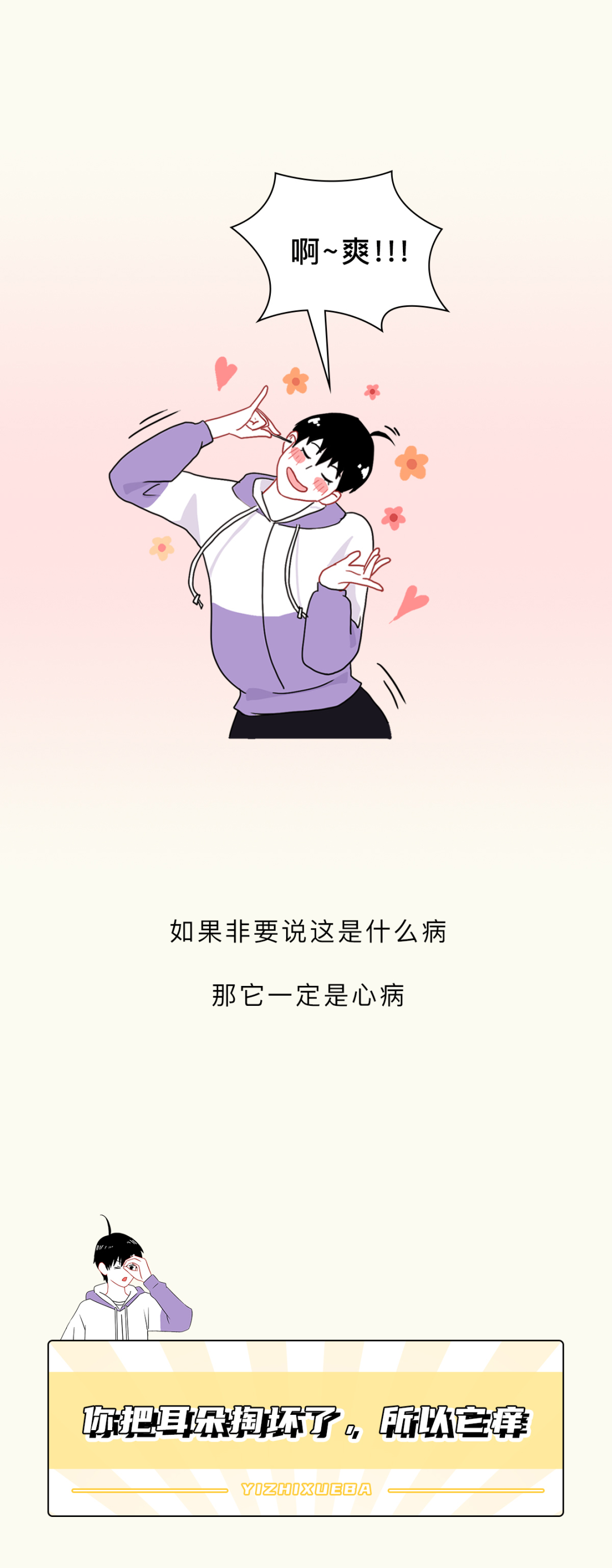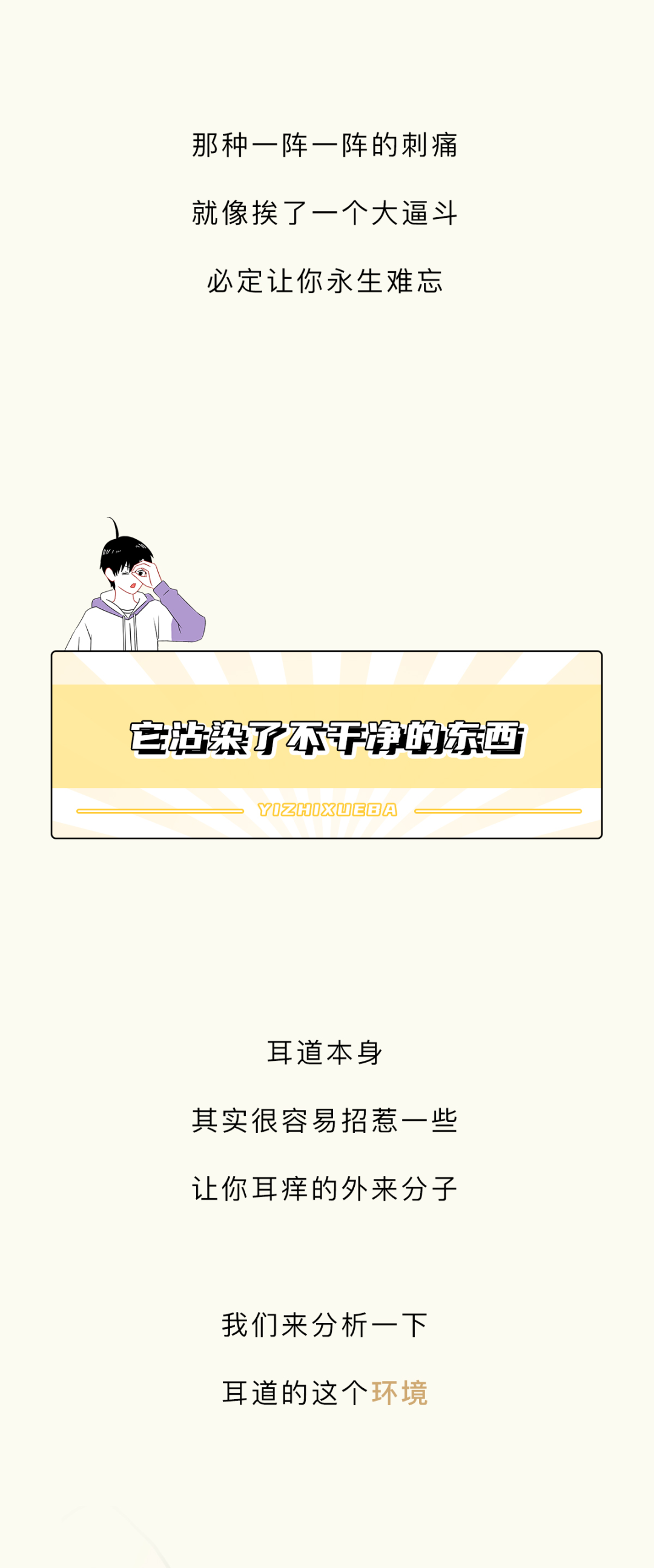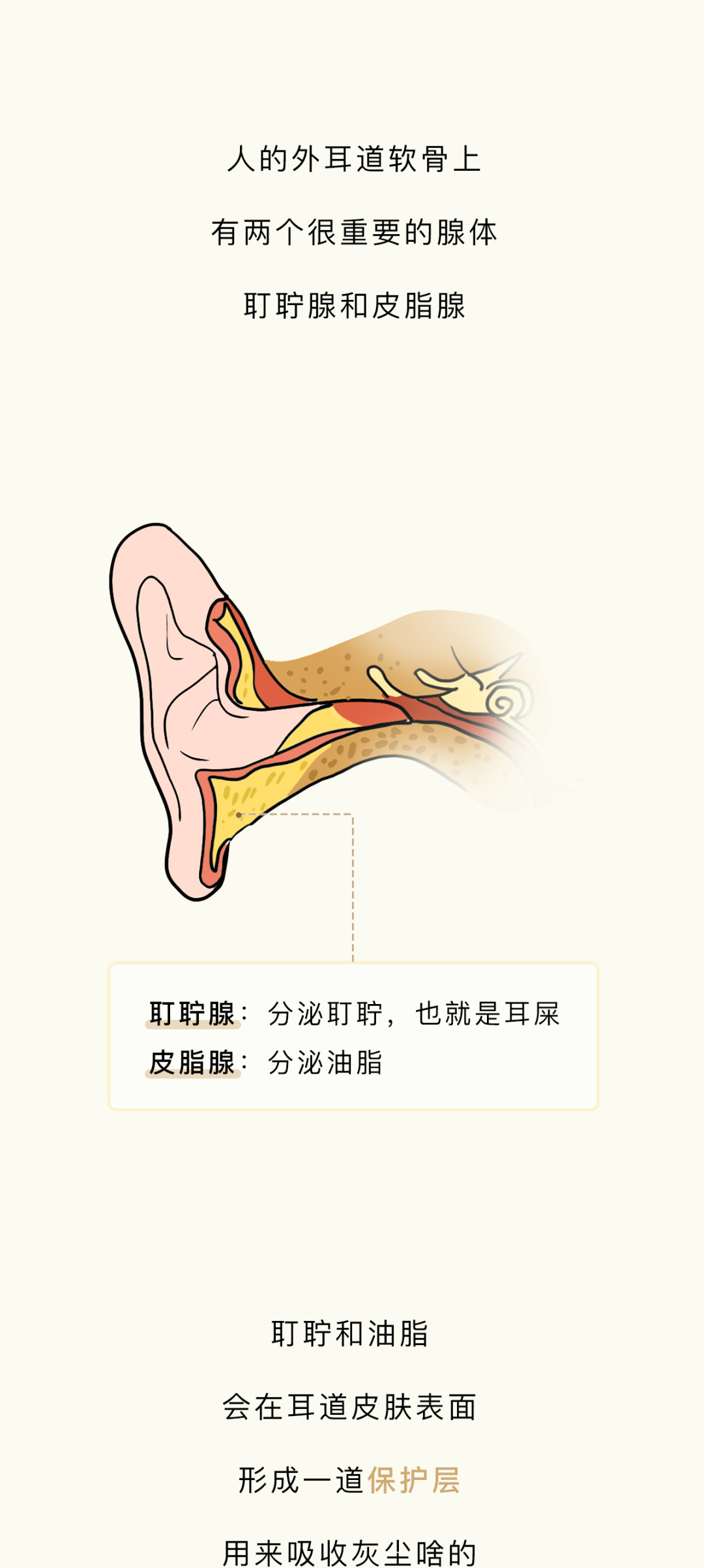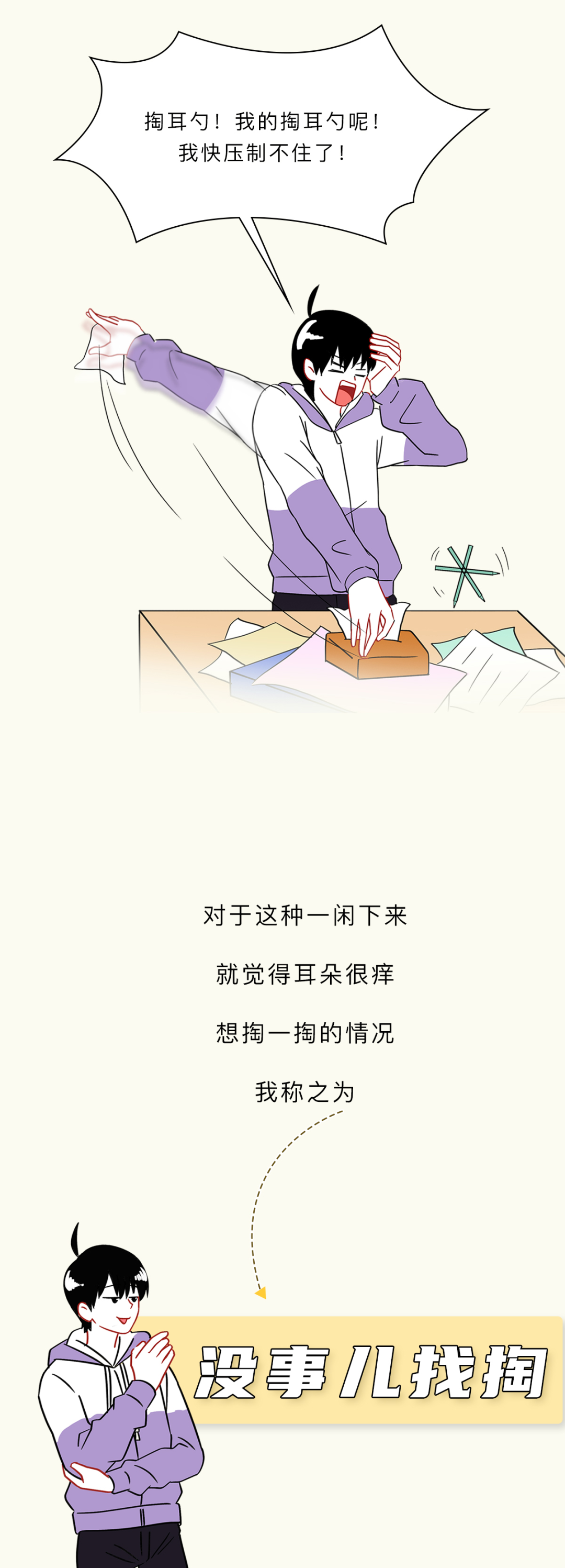 附录1.我一直感觉,掏耳朵这个行为,就像玩黄金矿工,掏出来的东西越大越爽。而且它跟黄金矿工一样,具备一定的随机性和挑战性,每一次下勺都是对你经验和判断的一种考验,当你什么也没掏出来的时候,那种失落感也和黄金矿工捞不上来东西如出一辙。一旦接受这个设定,我突然发现黄金矿工好像掏耳屎模拟器啊,连黄金都长得和耳屎很像2.不要用棉签去掏耳朵,因为棉签对耳道来说有点太大了,你们的耳屎往往个大且硬,粘上棉签的耳屎是少数,被推到耳道深处的耳屎才是大多数,谨慎啊谨慎,小心某一天在众目睽睽之下掉出来一个积攒了多年的巨型耳屎3.慢性外耳道炎这个东西,据我所知有的人是真不少,而且很多人是不知道的,建议每年体检的时候也好好看看耳鼻喉4.要是你们问我掏耳屎的正确办法,我的建议是不掏,它自己就会掉出来的。要是你的耳屎实在太多太大颗,可以去医院,医院有清洗耳道这项业务,价格也不贵参考资料[1]吴丽华,蒋刈,陈娟,黄少鹏,刘庆华,李瑞玉,叶青.真菌性外耳道炎的病原学特征及治疗效果[J].中华医院感染学杂志,2019,29(21):3288-3292.[2]李朝品.外耳道瘙痒症流行情况的调查研究[J].锦州医学院学报,1999(06):15-20.[3]周柯,孙菲,查定军,刘家云,马越云,郝晓柯,徐修礼.慢性外耳道炎患者分离溶藻弧菌的鉴定及生物学特性分析[J].中国病原生物学杂志,2020,15(02):146-151.DOI:10.13350/j.cjpb.200205.