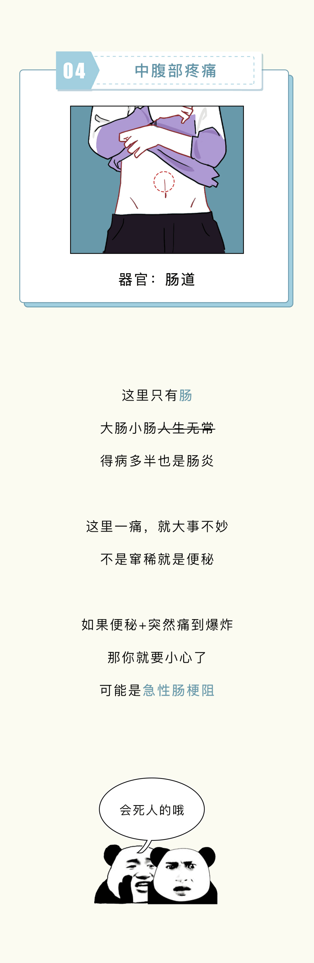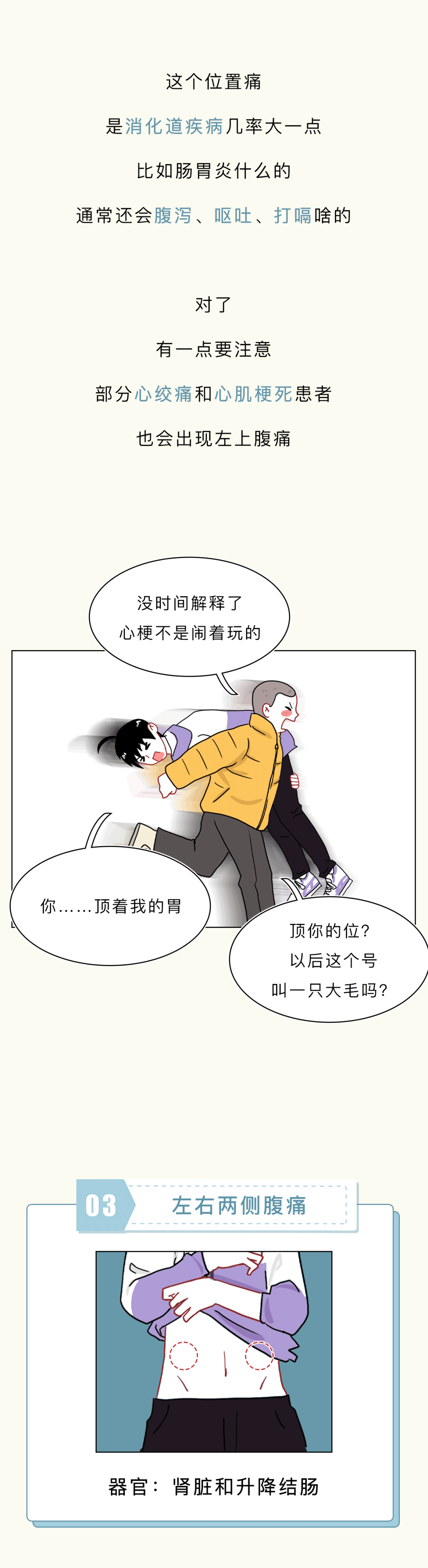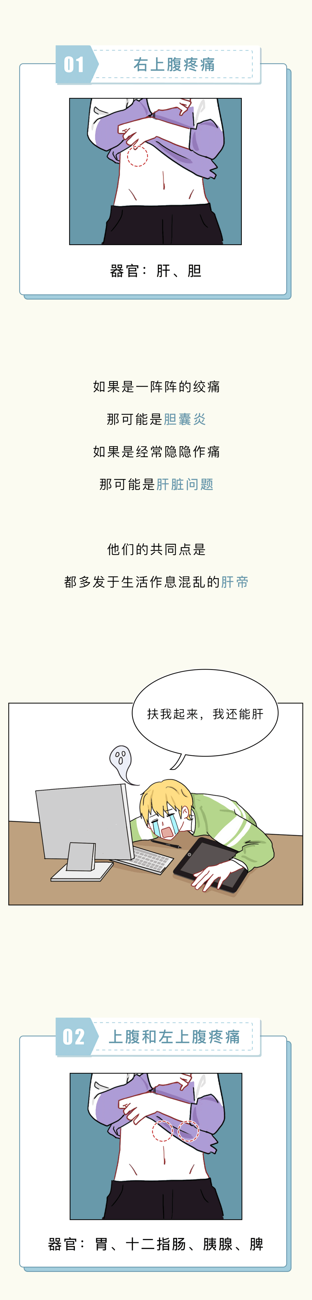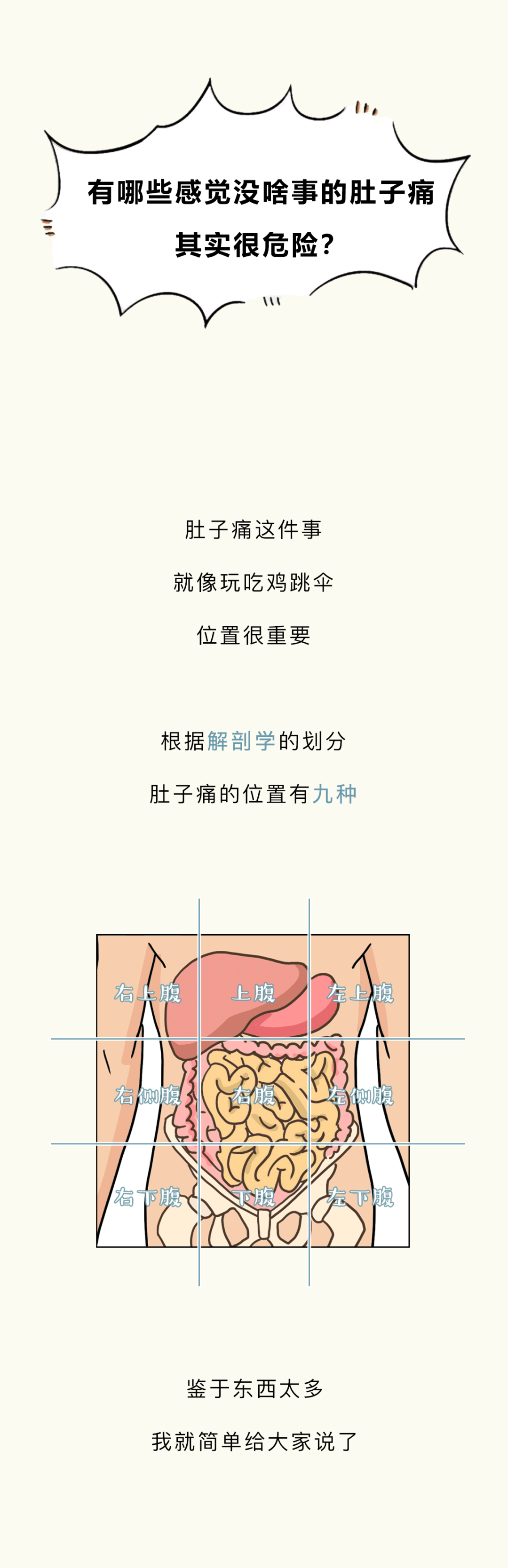 2.某些肚子痛,你可能搞不明白它到底是哪里在痛,因为它有可能是某种疾病导致的牵涉痛,一痛痛一片,这个时候你就不要自己瞎判断了,找医生吧还是