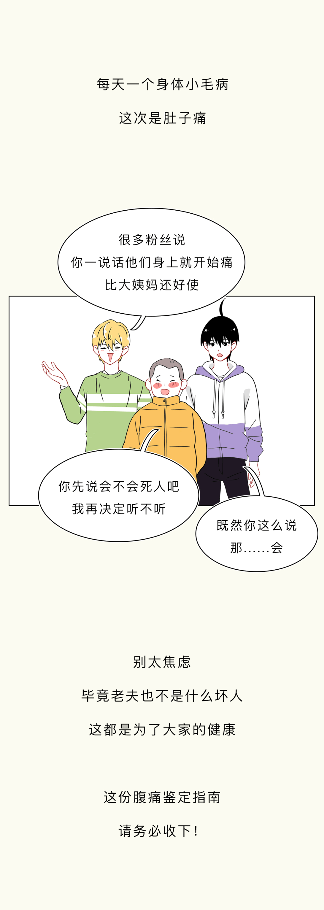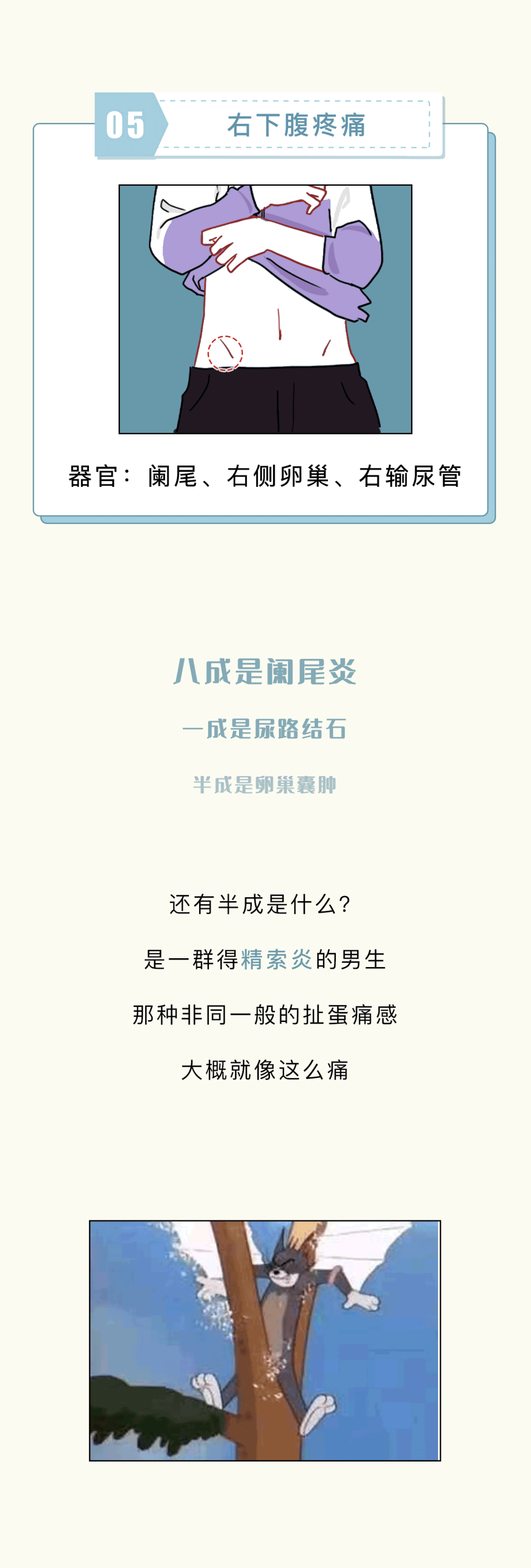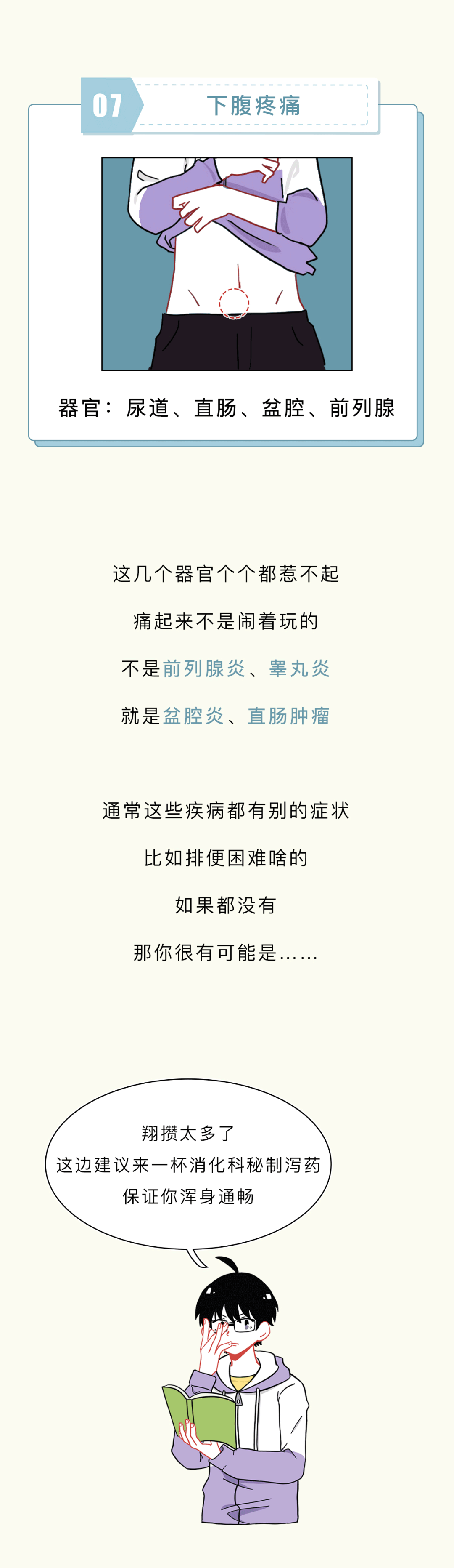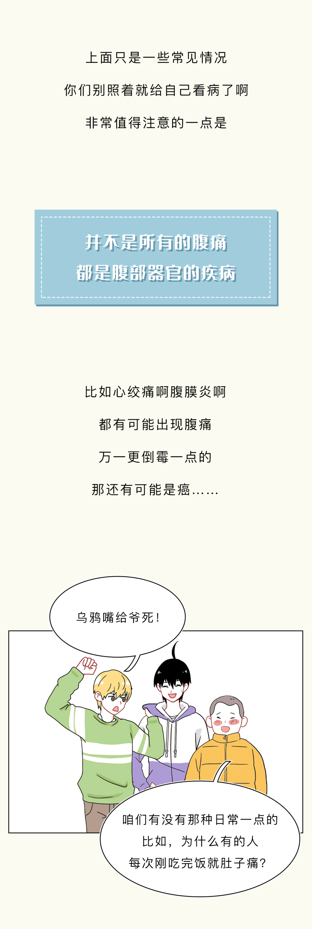 2.某些肚子痛,你可能搞不明白它到底是哪里在痛,因为它有可能是某种疾病导致的牵涉痛,一痛痛一片,这个时候你就不要自己瞎判断了,找医生吧还是