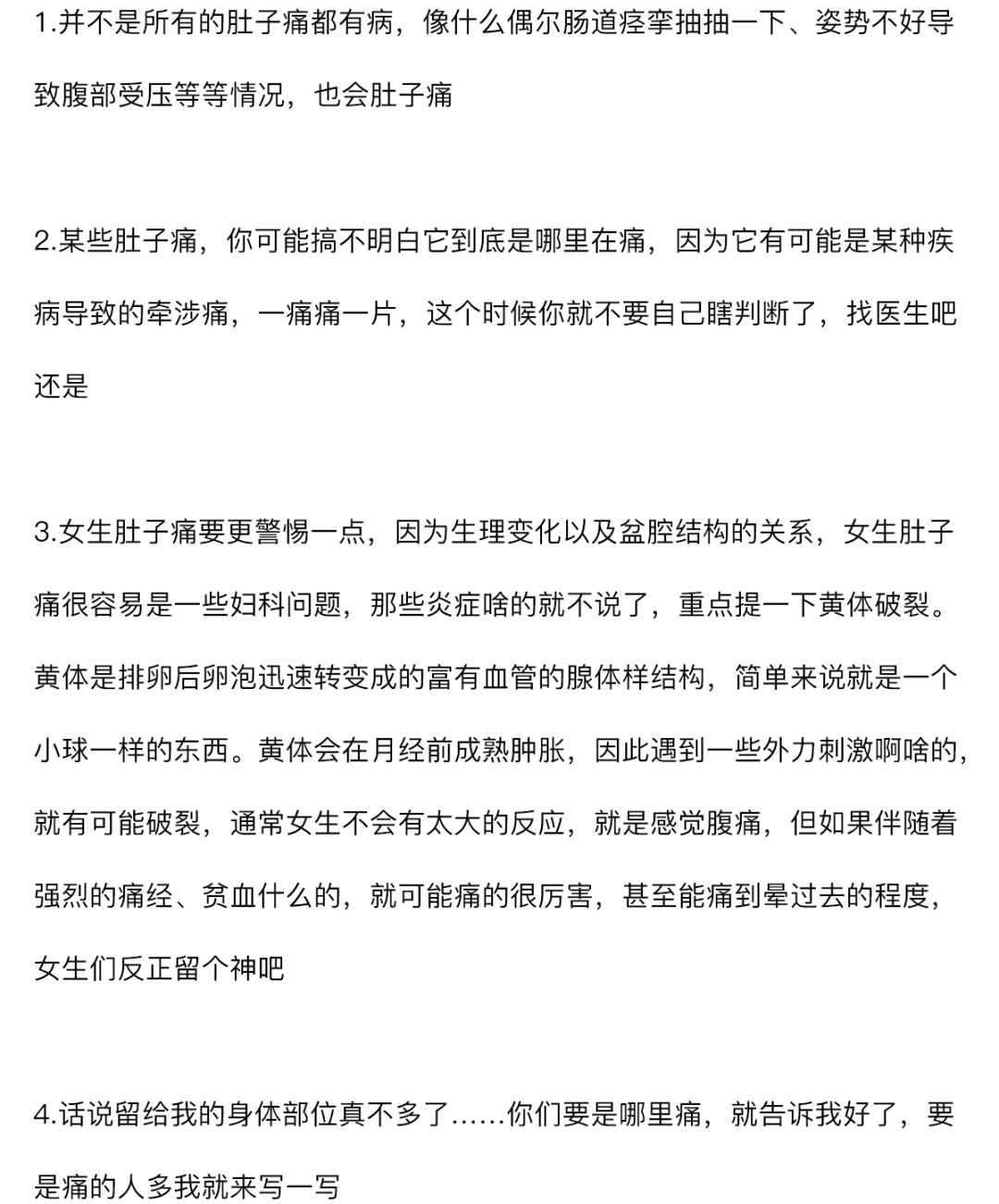3.女生肚子痛要更警惕一点,因为生理变化以及盆腔结构的关系,女生肚子痛很容易是一些妇科问题,那些炎症啥的就不说了,重点提一下黄体破裂。黄体是排卵后卵泡_百度百科迅速转变成的富有血管_百度百科的腺体样结构,简单来说就是一个小球一样的东西。黄体会在月经前成熟肿胀,因此遇到一些外力刺激啊啥的,就有可能破裂,通常女生不会有太大的反应,就是感觉腹痛,但如果伴随着强烈的痛经、贫血什么的,就可能痛的很厉害,甚至能痛到晕过去的程度,女生们反正留个神吧
