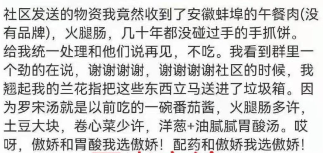 我看到一个所谓网红,正矫揉造作的秀出自己社区特意送来的“抗疫大礼包”。