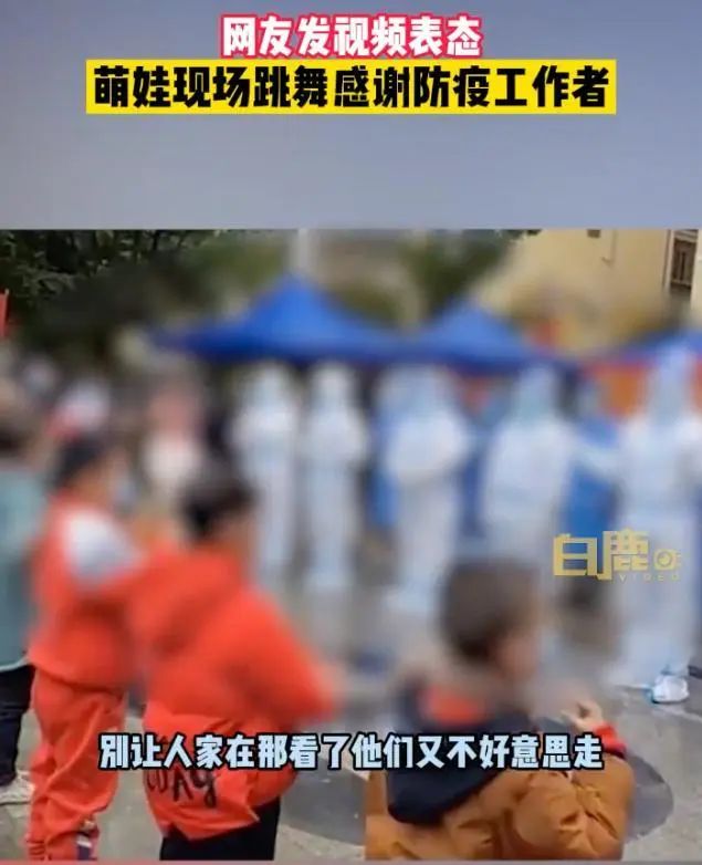 做了一天核酸的防疫大白们,整整齐齐像被罚站般站立着,只为看面前的孩子们载歌载舞,周围正是一圈围着孩子猛拍的家长们。