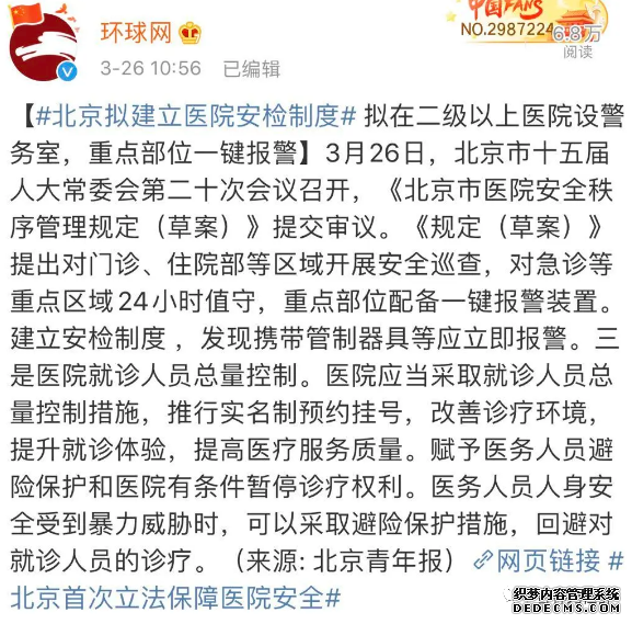 2017年7月11日,国家卫计委办公厅、公安部办公厅等联合发文《严密防控涉医违法犯罪维护正常医疗秩序的意见》,要求二级以上医院设安检!